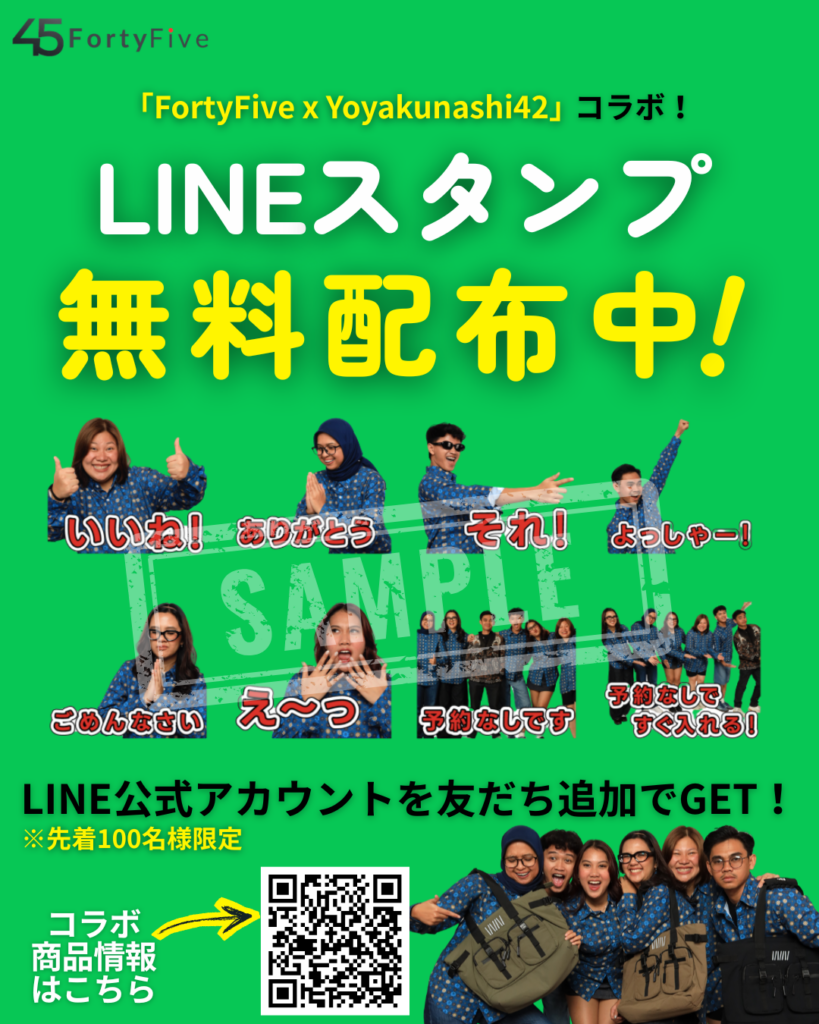 FortyFive45(フォーティーファイブ)は、ショップアンバサダーである「ヨヤクナシガールズ」(Yoyakunashi42)とのコラボレーション企画として実施したLINEスタンプ無料配布の第1弾について、先着100名様分の配布を終了したことをお知らせいたします。